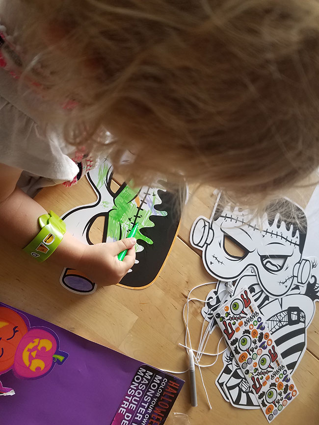 Color your own monster masks- these are fantastic because they are a cheap way to keep my 3 year old entertained. And her dad. Plus, they came with their own monster inspired markers.
